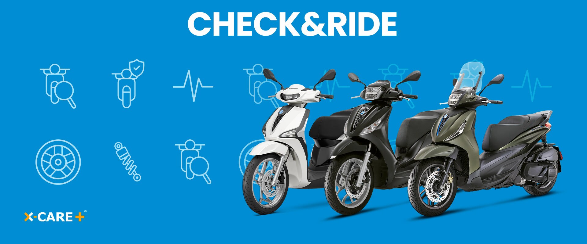Φροντίστε το Piaggio σκούτερ σας με το Check&Ride, το αποκλειστικό πρόγραμμα από το Δίκτυο Εξουσιοδοτημένων Συνεργείων της Piaggio, σχεδιασμένο για να σας προσφέρει έναν πλήρη και δωρεάν έλεγχο των κύριων εξαρτημάτων του οχήματός σας.